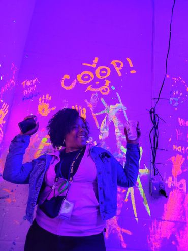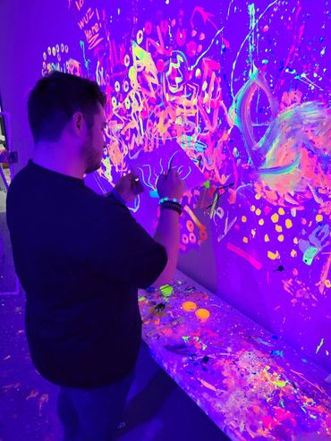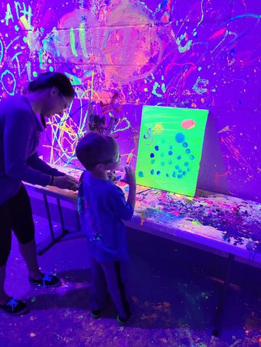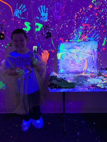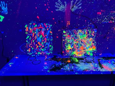 Splatter painting is a fun & unique experience for kids and adults to paint on a canvas and everywhere else. You will get a white canvas and neon color paint that will shine in our black light room.